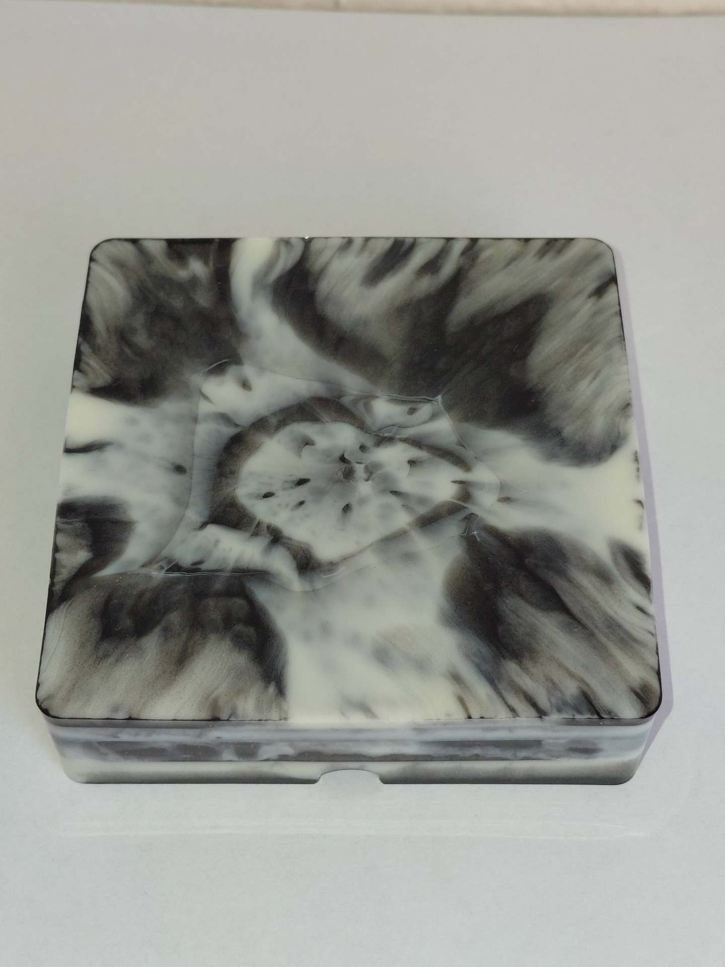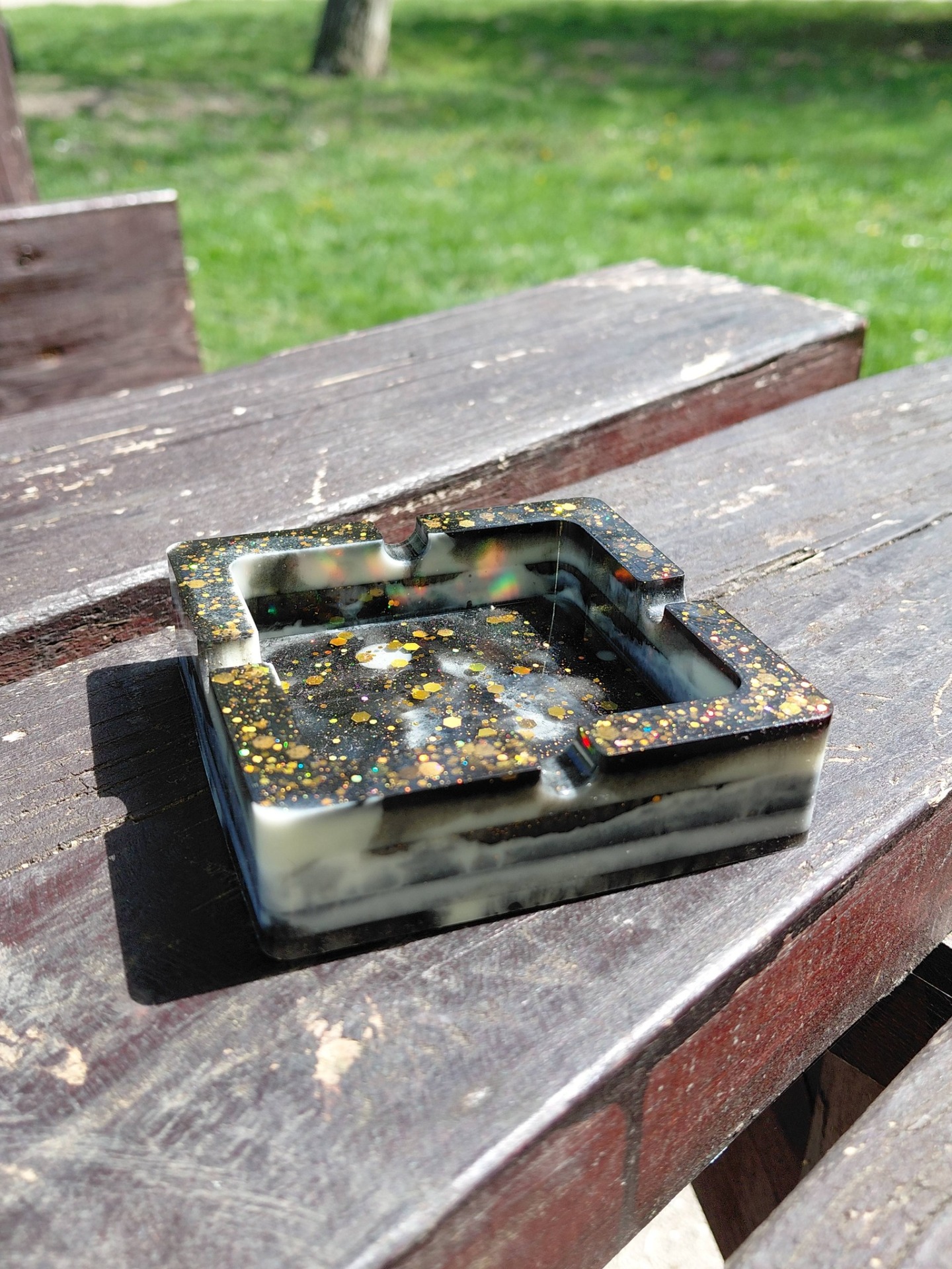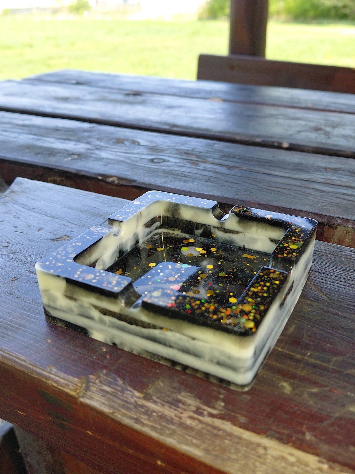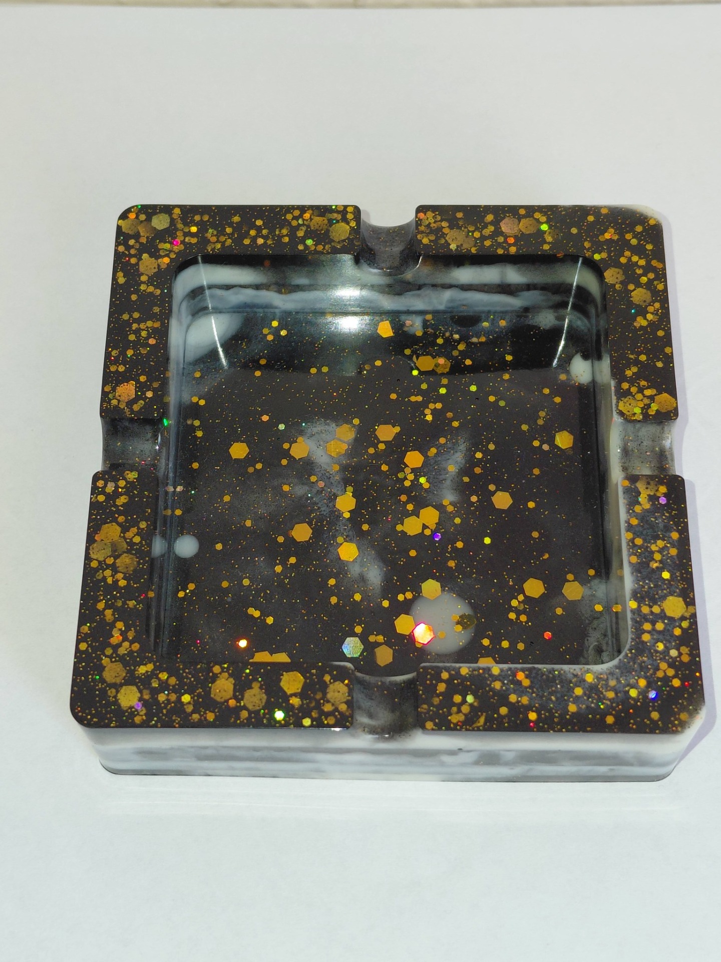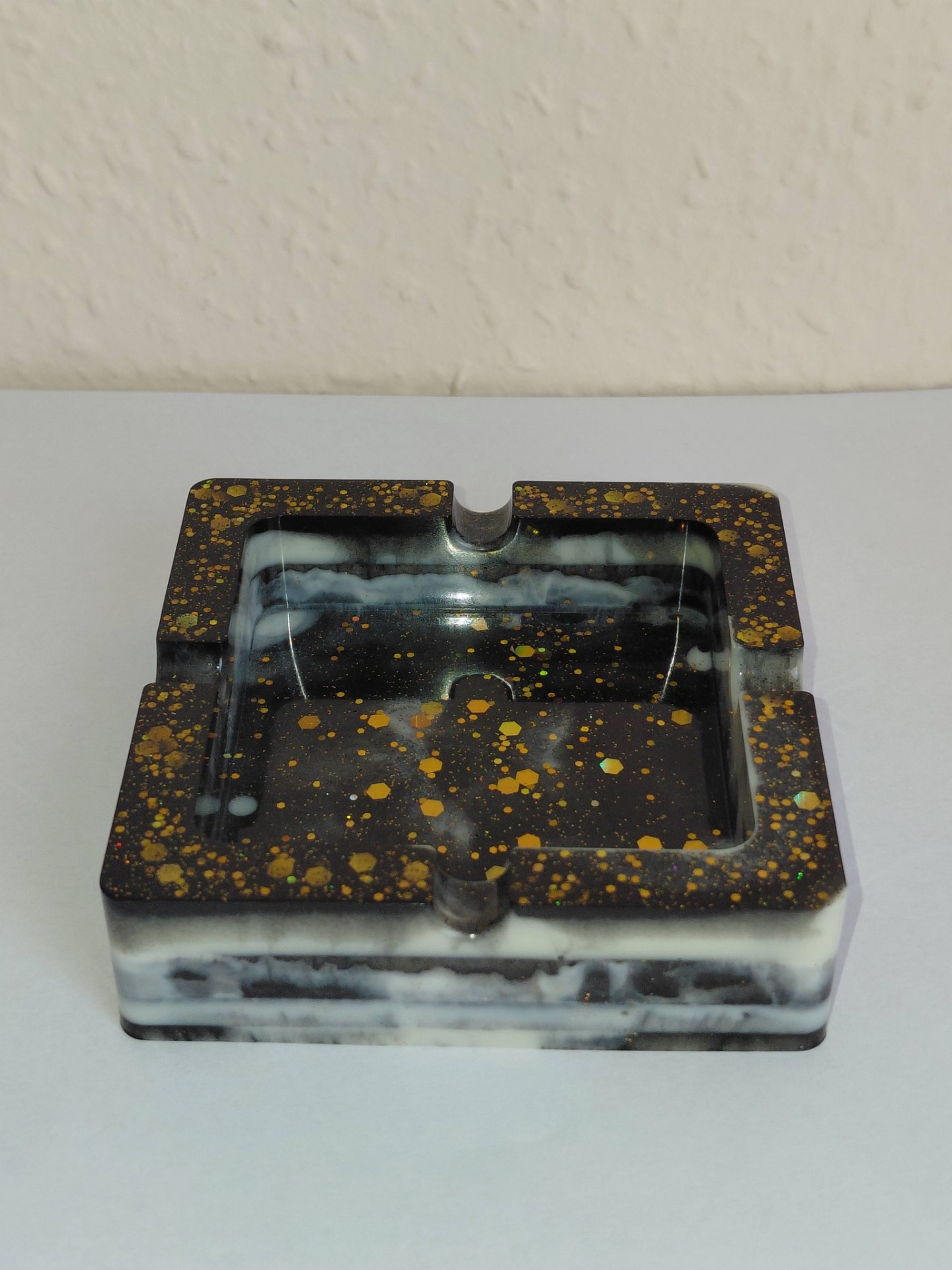 "Ez a kézzel készült gyanta hamutál tökéletes dekorációs elem a lakásban vagy irodában. Anyagának köszönhetően kellemes, természetes hatást kelt, miközben biztosítja, hogy a gyertya vagy füstölő alatti felület védve marad. Figyelem: használat során a hamu beleeshet, így érdemes óvatosan használni."